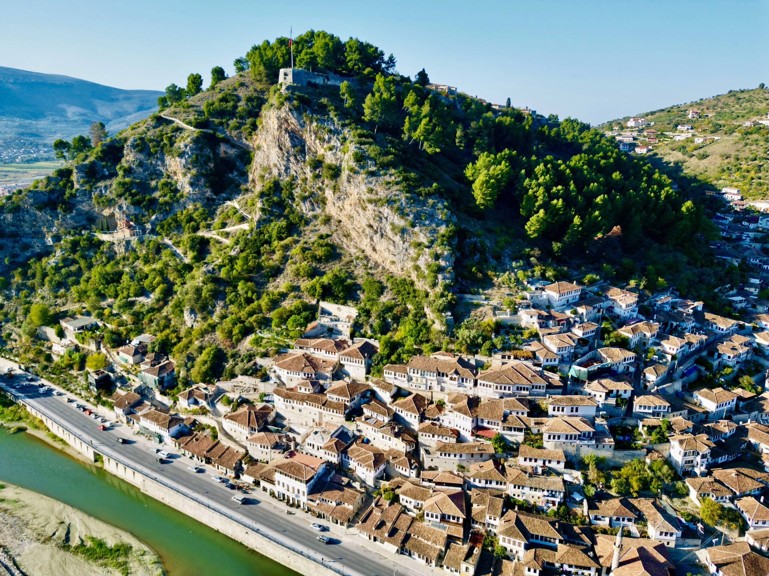 Berat – Et flot område i bjergrigt terræn, en gammel befæstet by og er et af landets vigtigste kulturelle centre. Blev udpeget til UNESCOs verdensarvsliste i 2008. Berat Castle ligger på toppen af byen og med huse beliggende op af bjergsiden og bliver kaldt de tusind øjnes by, som ses når der er lys i vinduerne om aftenen.